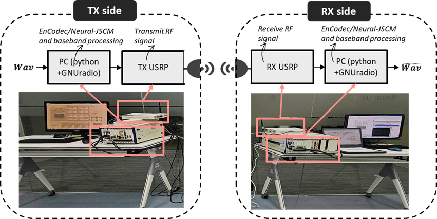 First, we built a 5G-based link-level simulator to study semantic audio communication under cellular conditions. This allowed us to compare our semantic JSCM system against conventional separation-based pipelines under controlled wireless impairments. Second, we built a hardware proof-of-concept (PoC) using Universal Software Radio Peripherals (USRPs), as shown in Fig 2, in a Bluetooth-band setup to test whether the same idea still works over a real air interface. Both evaluations were conducted using the LibriSpeech dataset [4], and benchmark systems were trained and tested under fair resource conditions.