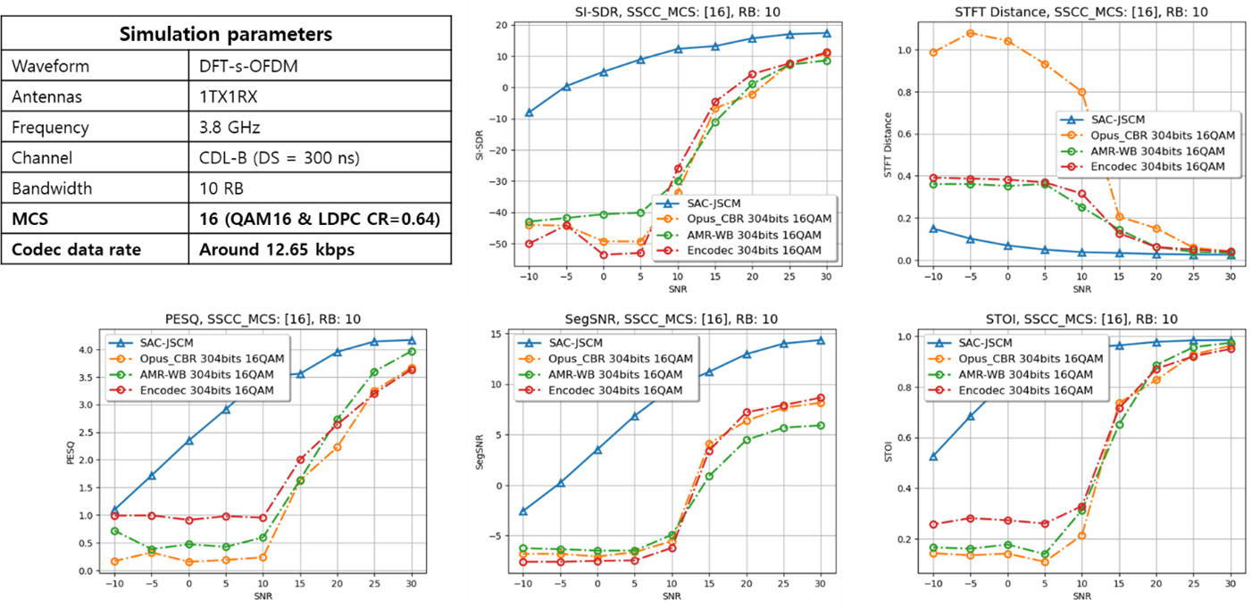The most important result is straightforward: semantic audio communication can maintain similar perceptual quality at roughly 10 dB lower SNR or transmit power than conventional benchmark systems. This trend appears both in our 5G-based link-level simulations and in the hardware proof-of-concept.