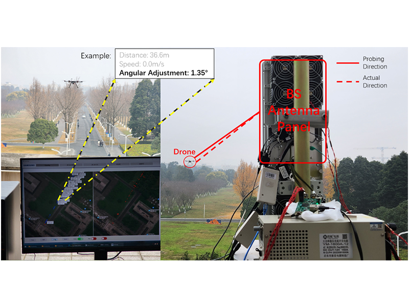 To verify the feasibility of proposed DBF in realistic environment, hardware test is performed. The tested scenario is shown in Fig. 4. In this test scenario, a BS functioned with the proposed DBF scheme is probing a drone which is regarded as differently located CPE users. The BS estimates the angular direction based on simultaneous processing of sum beam and differential beam on the received signal from the drone. In the test, the antenna panel of BS is divided into four sub-panels and a Rx DBF is implemented based on this antenna structure. Specifically, mmW band with carrier frequency 28 GHz is used and antenna panel used in the hardware test consists of 256 antenna elements, forming a 16 × 16 UPA. The hardware test results on the angular adjustment estimation are shown in Table. I. From these results, it can be observed that with the aid of DBF, it is feasible to get accurate angular domain estimation with granularity of 0.05 degree. It then can facilitate BS to assign better beam to CPE UEs in different locations.
