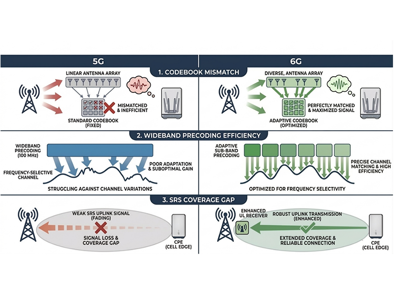 One major limitation of today’s 5G uplink is that its codebook design does not fully reflect the diversity of practical FWA CPE antenna structures. Unlike smartphones, FWA devices can adopt a wider range of antenna layouts, and this makes a single rigid codebook less effective.
