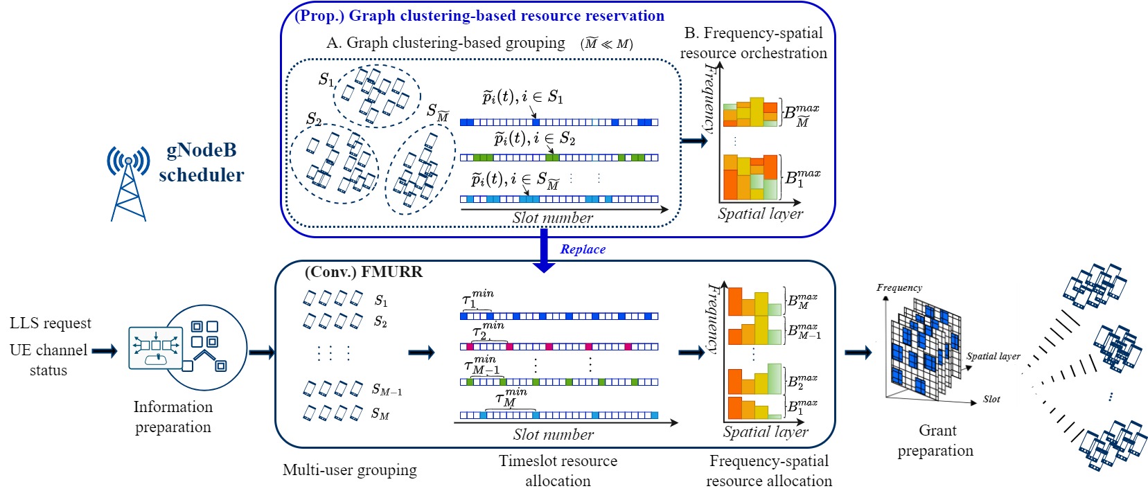 Our proposed framework consists of two main components: the graph clustering-based grouping module and the frequency-spatial resource orchestration module, as shown in Figure 2. The first module introduces probabilistic multiplexing gain as the weight of edge of UE graph, then groups UEs into multiple multi-user sets by utilizing the highest probabilistic multiplexing gain to improve the reserved timeslot efficiency. Inspired by the makespan optimization problem, the second module allocates frequency-spatial resources for each multi-user set with minimum frequency overhead. As a result, both timeslot and frequency resources reserved for low-latency service (LLS) UEs are optimized.