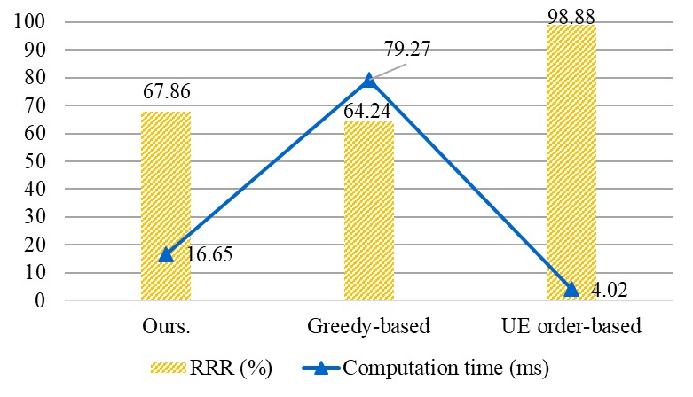 Then, the performances of the proposed frequency-spatial resource orchestration scheme are examined. We compare the proposed scheme with the greedy-based and the UE order-based RR scheme, respectively. In Figure 5, the RRR of the proposed scheme is close to the the greedy-based allocation scheme, but the proposed scheme gains 78.99% (proposed: 16.65 ms, greedy-based: 79.27 ms) in the computation time cost. The UE order-based scheme exhausts almost all frequency resources showing the worst performance.