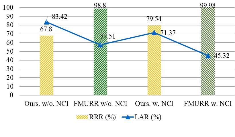 Finally, to verify the performances of the overall solution, we compare the performances with FMURR in the scenario with NCI impact and the scenario without NCI impact. As shown in Figure 6, our proposed solution reserves less resources with higher LAR in both with and without NCI scenarios. As channel quality in the scenario without NCI is better than which with NCI, up to 31% gain in RRR and 25.91% gain in LAR are obtained in the scenario without NCI impact. We also check the computation complexity in this case. The result shows upto 33.25% computation time cost is reduced with the pre-grouping procedure.