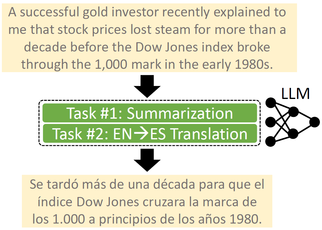 Figure 1. Compositional multi-tasking involves performing multiple tasks simultaneously, such as summarization and translation. The challenge lies in executing all tasks jointly within a single inference pass for optimal efficiency, rather than performing them separately through multiple inferences