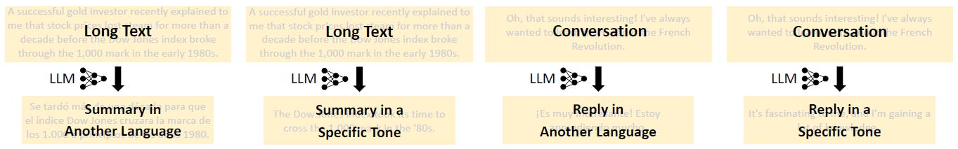 Figure 2. Overview of the four compositional tasks in our benchmark. The tasks include three translation settings (English to Spanish, French, and German) and four tone variations (professional, casual, witty, and neutral paraphrase), leading to fourteen sub-tasks overall