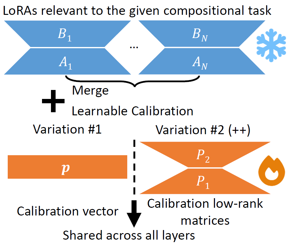 Figure 3. Our Learnable Calibration. We add a small number of calibration parameters to correct the initial merged LoRAs. Variation #1 uses a calibration vector of biases, while Variation #2 (++) uses two calibration low-rank matrices