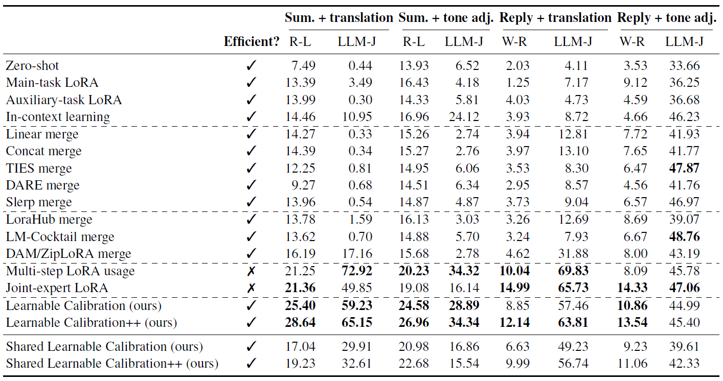 Table 1. Benchmark of compositional multi-tasking. Test results reported as % (↑) and averaged across models and languages or tones. Our Learnable Calibration methods achieve comparable performance to inefficient baselines while being significantly more efficient in terms of inferences and storage. Similarly, fast baselines, such as various merging strategies, typically fail in compositional multi-tasking. The metrics include ROUGE-L (R-L), Weighted ROUGE (W-R) and LLM judge (LLM-J) scores. The Efficient? column captures both runtime and storage efficiency. The bottom block includes results for a version of Learnable Calibration where additional parameters are shared across all four tasks. The best three methods from the main set of results are in bold