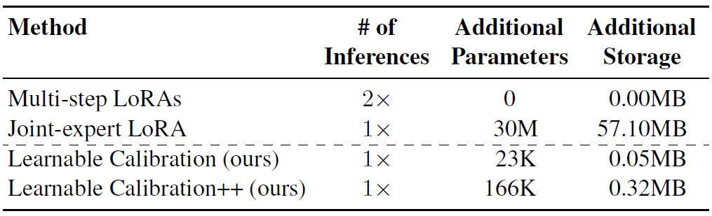 We compare the efficiency of our solutions against the two well-performing but inefficient baselines in Table 2. Our solutions require only a minimal number of additional parameters, amounting to approximately 0.08–0.56% of the parameters of a joint-expert LoRA. The resulting additional storage on disk is less than 0.5 MB, making our solutions suitable for on-device deployment.