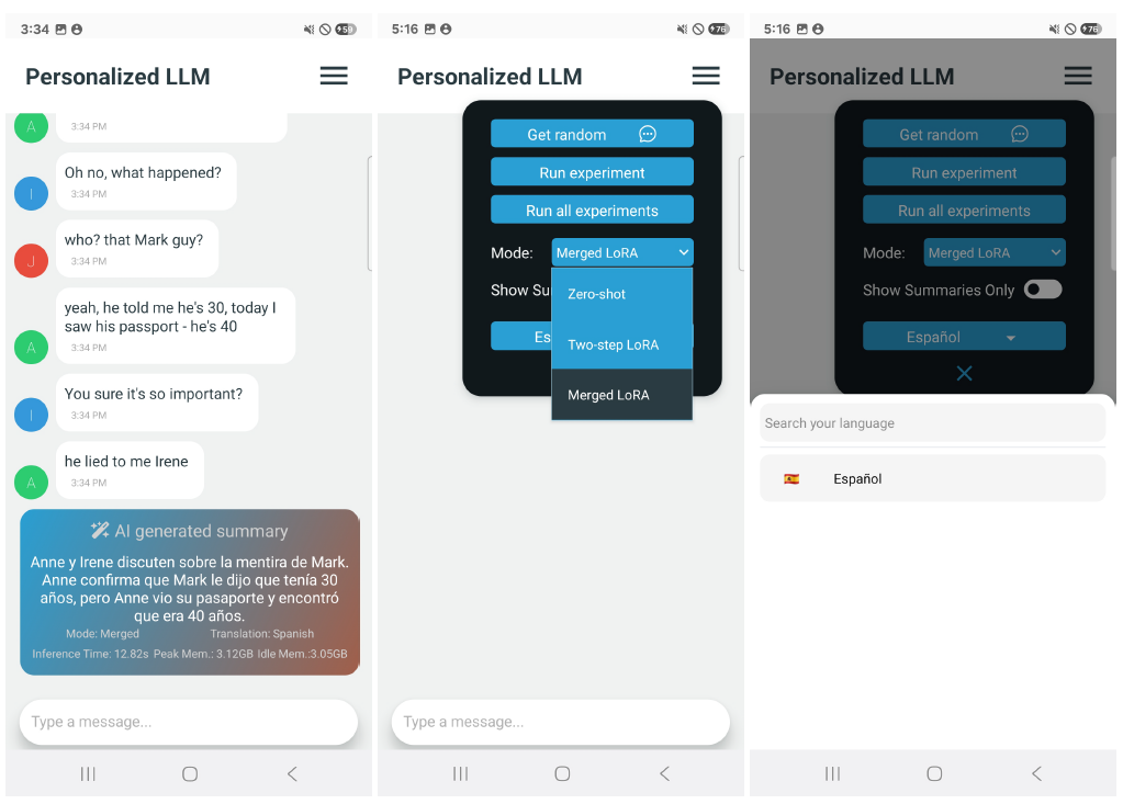 To better showcase and investigate compositional multi-tasking for on-device use cases, we have developed an application that performs compositional multi-tasking fully on-device. We built the back-end in Rust and the front-end in React Native, utilizing mistral.rs [1] package for LLM and adapter management. The application focuses on summarization of conversations in another language, which is one of the multiple practical use cases of compositional multi-tasking. Screenshots of the application are included in Figure 4.