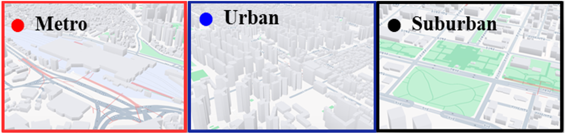 where $ \mathcal S$ represents statistical aggregation process. $ \Psi_l$ indicates observed individual wave radiation during a sounding, which determined by nearby material properties (e.g., permittivity, permeability, conductivity, edge geometry, and roughness). We adopt NVIDIA Sionna RT (Ray-Tracing) [2], a differentiable ray-tracing simulator that reflects real-world geography as a virtual sounder. In addition, geographic reliability is improved not only with mobile-device logs such as SINR (Signal to Interference plus Noise Ratio), which capture the effect of real propagation and radiation patterns, but also with commercial BS operational data, so that the virtual environment can be calibrated more consistently to commercial-network observations. Material properties in the virtual sounder are then tuned until the simulated results closely approximate the target data.