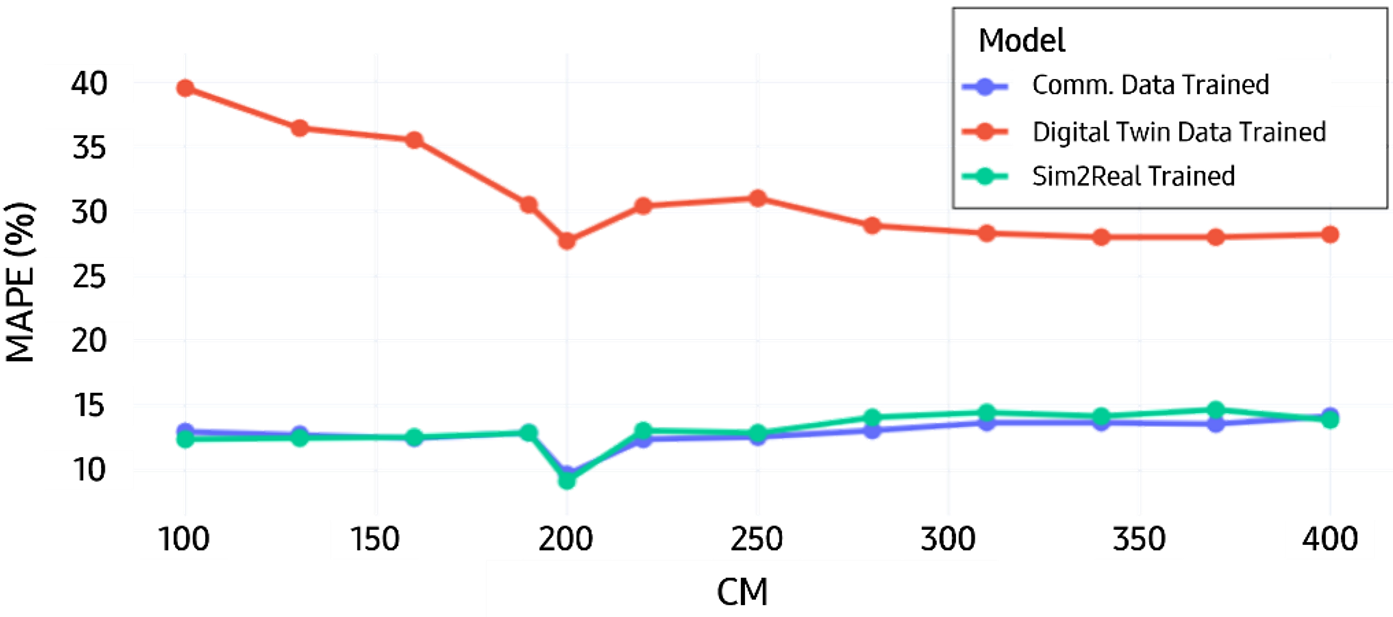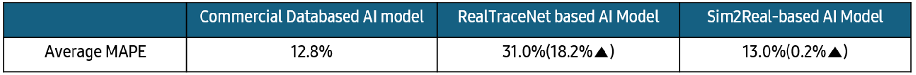 The offline evaluation supports this interpretation. As summarized in Table 1 , the model trained only on commercial data achieved an average MAPE (Mean Absolute Percentage Error) of 12.8%, whereas the model trained only on Digital Twin data showed much poorer performance with a MAPE of 31.0%. By contrast, the Sim2Real model achieved a MAPE of 13.0%, only 0.2 higher than the commercial-data-only reference. Despite the large simulation-to-real gap, this result indicates that the proposed transfer method can recover prediction performance close to the commercial-data baseline.