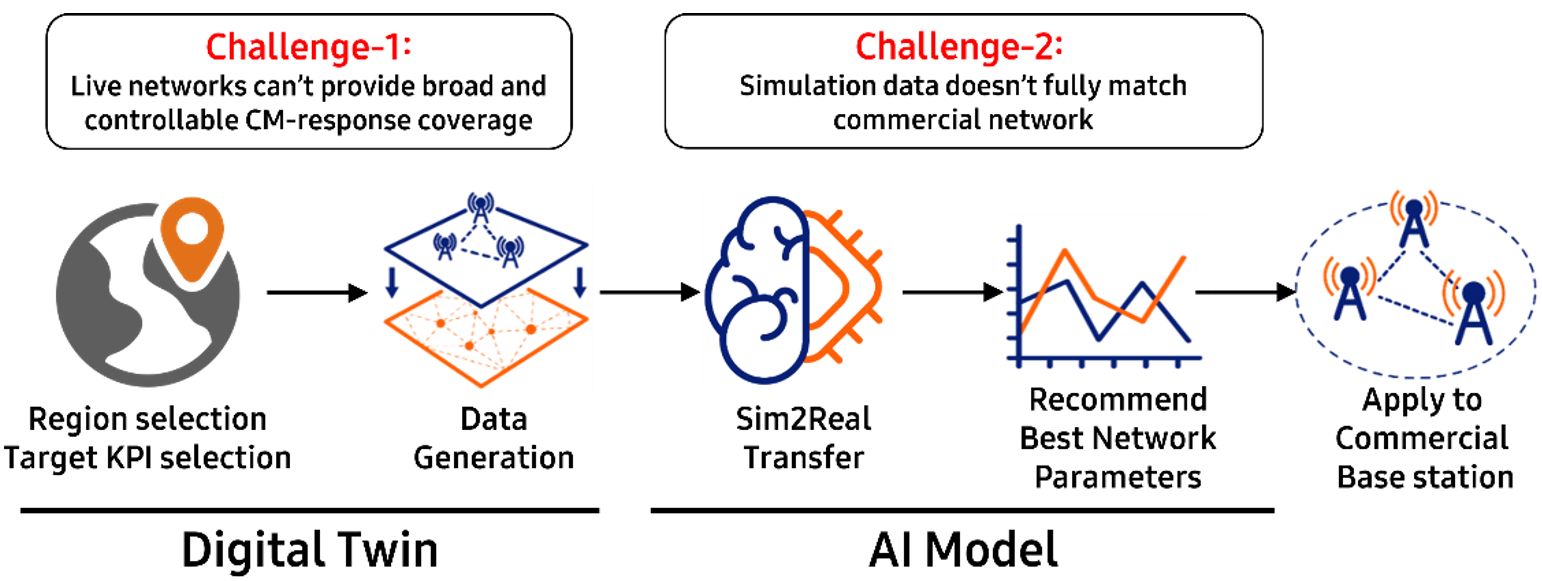 The second stage is handled by the AI model, which uses this simulated data together with commercial data to perform Sim2Real transfer, learn a CM selection policy that can be applied to the commercial network. This stage addresses the second core challenge: the gap between simulated and real network behavior. Rather than using simulation output as-is, the model aligns the transferable CM-response knowledge learned in the Digital Twin with the operating characteristics of the commercial network, and then applies the recommended CM to the commercial BS (Base Station) .