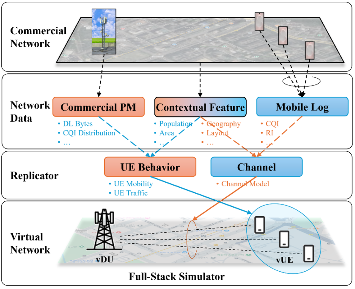The performance of data-driven network optimization is fundamentally constrained by the diversity of training data. In commercial networks, however, collecting data for rare or extreme network environments, or through broad exploration of potentially risky CM settings, is often infeasible. To address this limitation, we develop RealTraceNet, a high-fidelity network simulator designed to generate realistic training data beyond what can be safely observed in the field. As illustrated in Fig ure 2, its fidelity comes from combining real BS equipment used as the vDU with in-house virtualized UE (User Equipment) components that are implemented to behave very similarly to commercial devices, together with a Replicator module that injects site-specific real-world characteristics into the simulator.