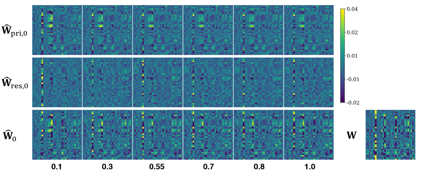 Figure 2. This visualization shows how the initialized primary path ($\widehat W_{pri,0}$), residual path ($\widehat W_{res,0}$), and their sum ($\widehat W_0$) effectively reconstruct the original weight $W$, even at very low BPWs