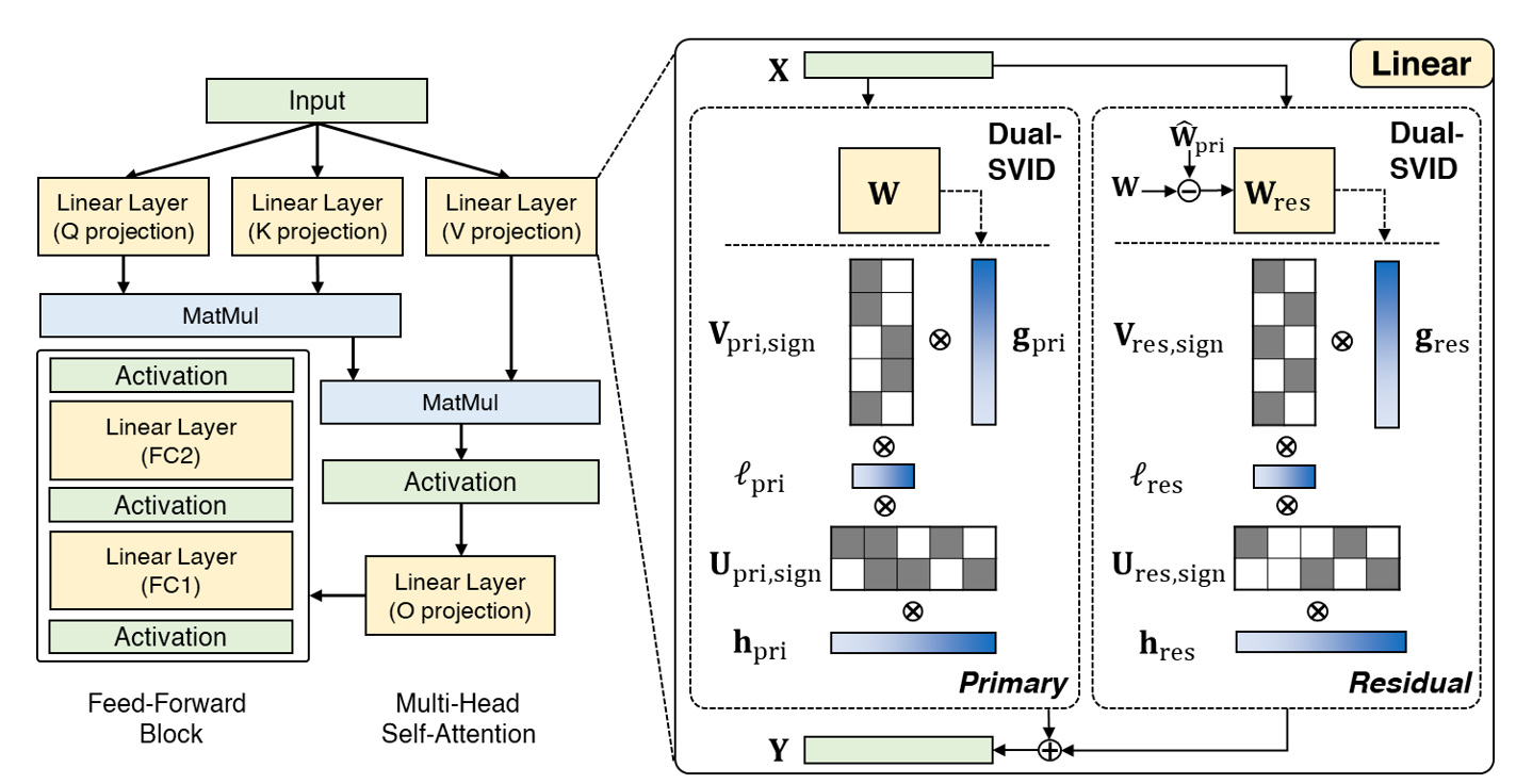Figure 1. Comparing a standard Transformer layer (left) with the LittleBit architecture (right). The LittleBit layer shows the parallel Primary and Residual pathways