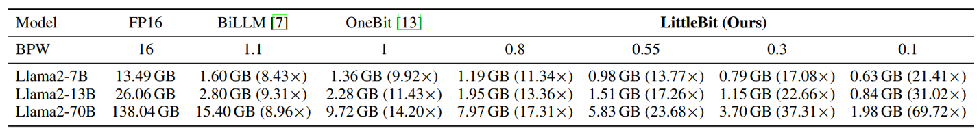 - Llama2-7B (FP16 13.49 GB): Compresses to 0.79 GB at 0.3 BPW (>17x reduction) and 0.63 GB at 0.1 BPW (>21x reduction).