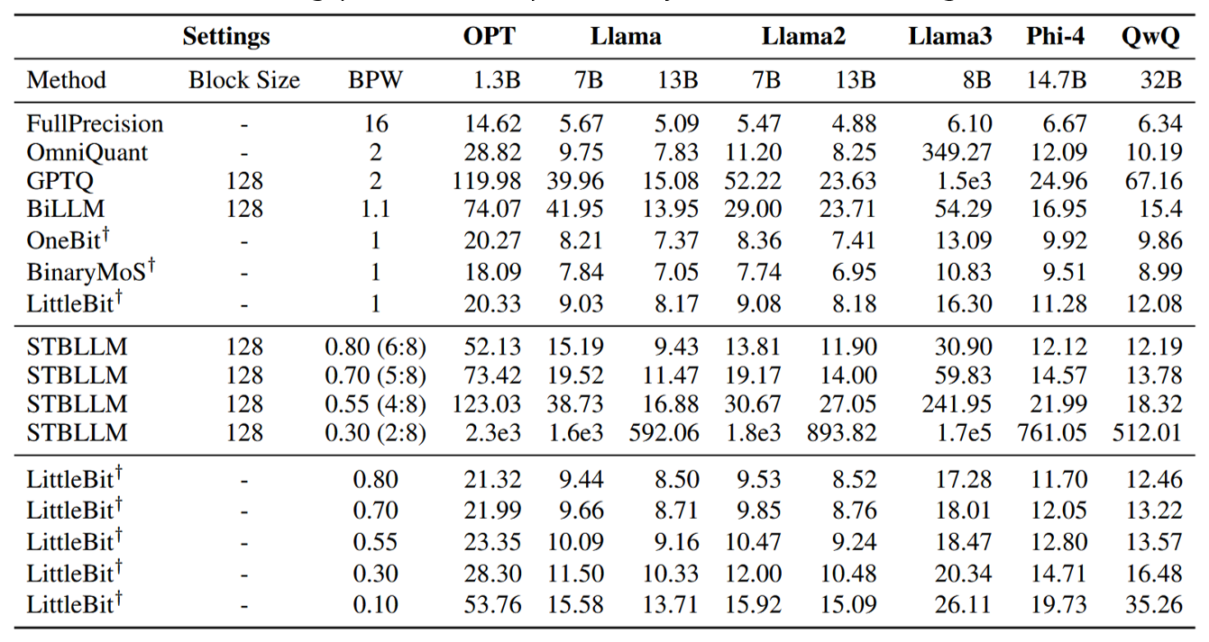 - Llama2-7B @ 0.55 BPW: LittleBit achieves a PPL of 10.47, a massive improvement over STBLLM's 30.67.