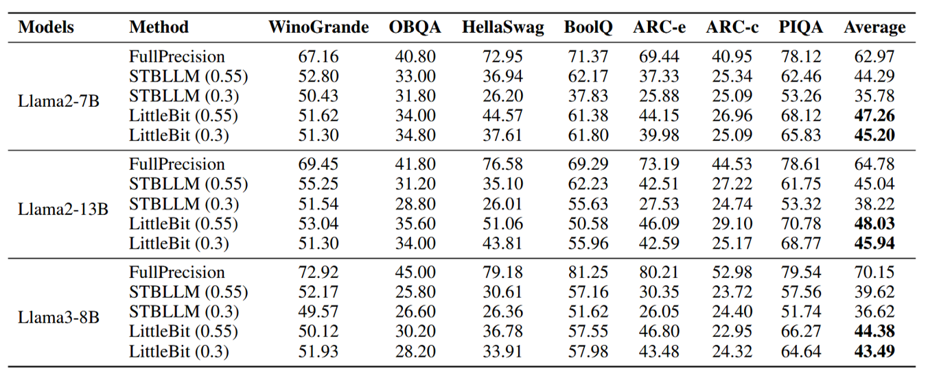 - Llama2-7B @ 0.3 BPW: LittleBit maintains a 45.20% average, which is still higher than STBLLM at 0.55 BPW, demonstrating exceptional knowledge preservation even under extreme compression.