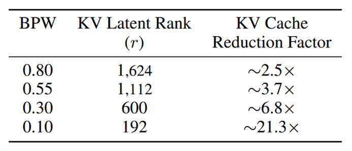 This reduces KV cache memory by a factor of $∼d_{model}/r$. For Llama2-7B at 0.1 BPW, this translates to a ~21.3x reduction in KV cache size.