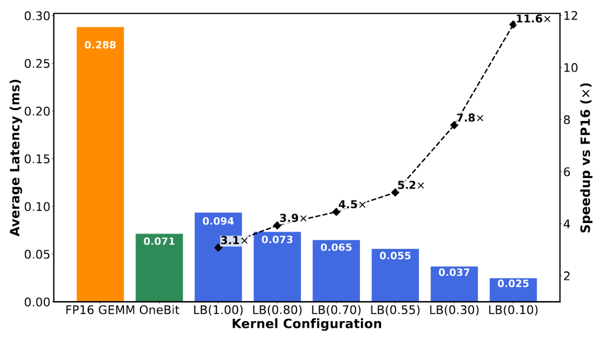 - Kernel-Level: For a Llama2-70B MLP layer, the LittleBit kernel at 0.1 BPW achieves a staggering 11.6x speedup over the optimized FP16 baseline.