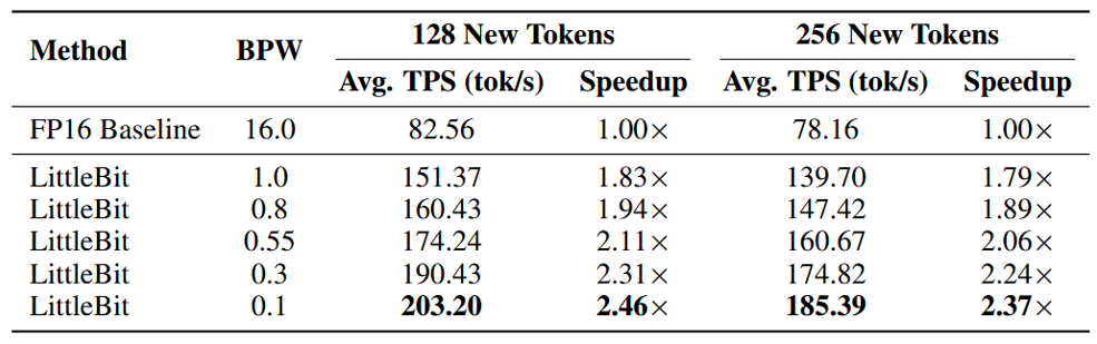 - End-to-End Throughput: This kernel-level speed translates to real-world gains. A Llama2-7B model using LittleBit (0.1 BPW) achieved 203.20 tokens/second, a 2.46x speedup over the FP16 baseline (82.56 tok/s) in end-to-end decoding.