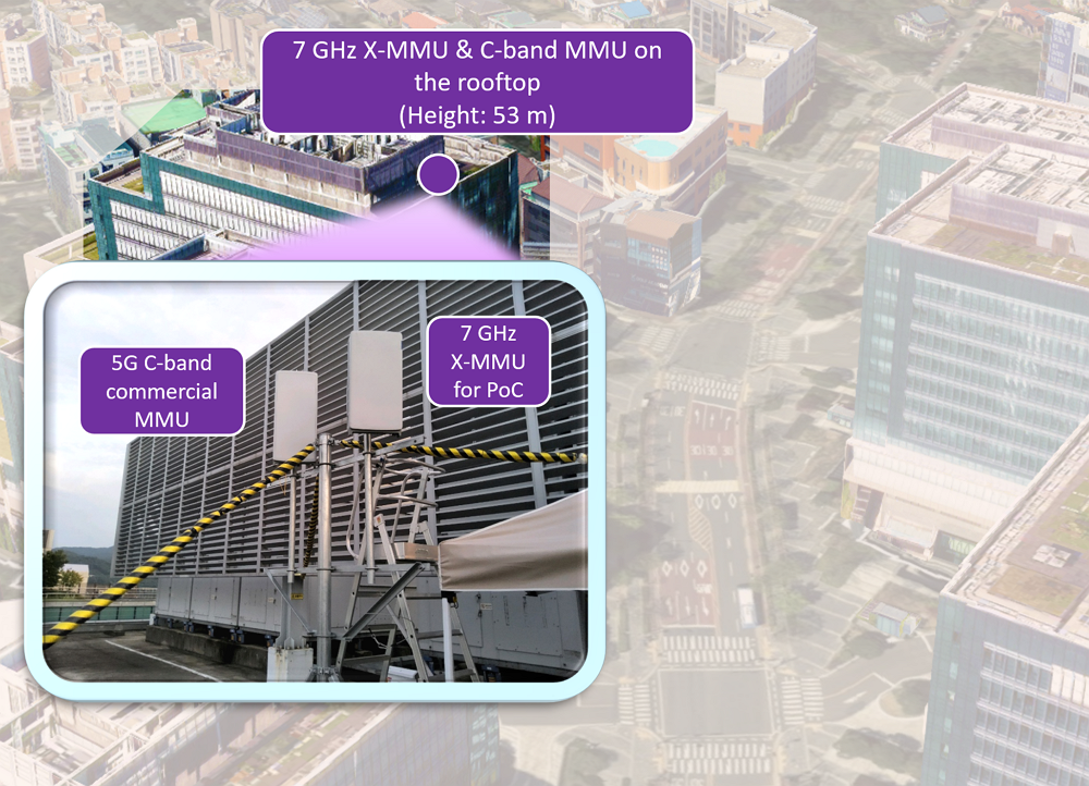 As can be seen from Figure 3, we install our X-MMU on the rooftop of one of the campus buildings, positioning it at a height of approximately 50 meters above ground level. This elevation allows us to simulate urban base station deployment scenarios while providing coverage to both outdoor and indoor areas. The X-MMU is configured with a proper downtilt angle to optimize coverage across the test area. Furthermore, we also mount a commercial radio unit for 5G massive MIMO (called MMU) operating in the 5G C-band, for the purpose of coverage performance comparison with our 7 GHz base station.