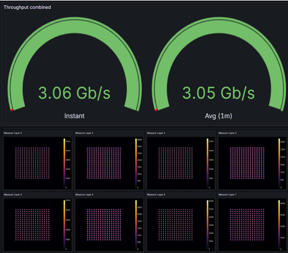 The capacity results from our field trial demonstrated the significant potential of the 7 GHz band for 6G. Our most significant achievement was the successful demonstration of 8-level MIMO in the downlink, i.e., simultaneously transmitting 8 data streams (i.e., 8 layers) over-the-air, together with the modulation order of 256QAM, reaching a peak data rate higher than 3 Gbps. In Figure 4, we demonstrate the measurement result of the downlink data rate measured at the UE emulator side, showing 3.06 Gbps of data rate and also the constellation plot of 8 data streams each with 256QAM, achieved at a location with NLOS channel condition and about 100 m distance from the base station.