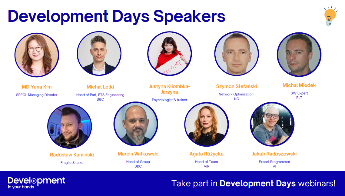 In March 2023, Samsung R&D Institute Poland (SRPOL)’s People Group organized an event called Development Days – a special 4-day event for all our SRPOL colleagues for whom the idea of development is close to the heart. The event was organized online in a ‘hop-on hop-off’ form so that each person could individually choose the most interesting parts of the agenda and freely join the presenters during each day. Almost 500 participants logged onto the meeting links throughout the four days, joining various activities.