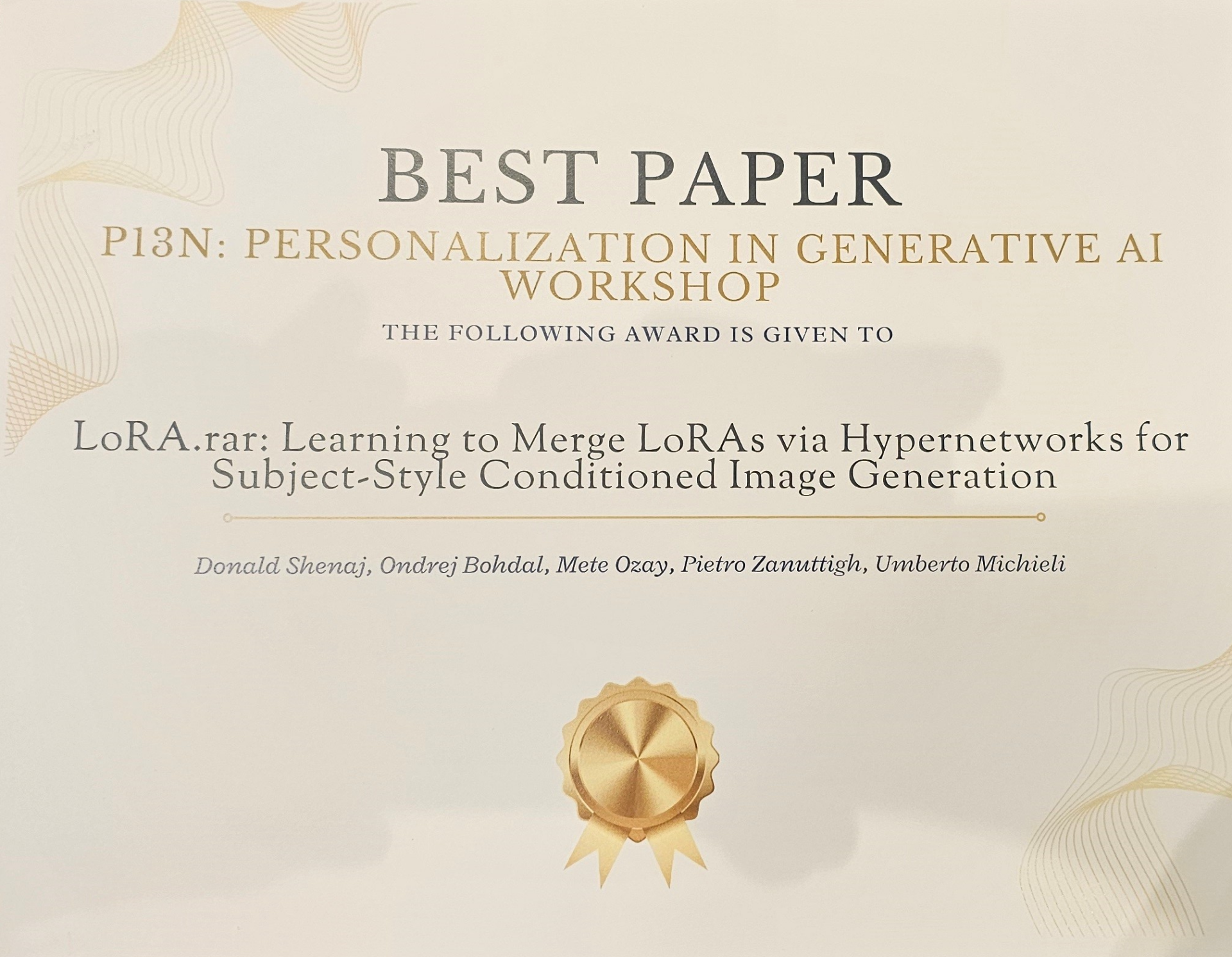 Samsung R&D Institute UK (SRUK) is thrilled to announce that its researchers have won the Best Paper award at the ICCV 2025 Personalization in Generative AI Workshop for their paper titled “LoRA.rar: Learning to Merge LoRAs via Hypernetworks for Subject-Style Conditioned Image Generation”. The proposed LoRA.rar method not only improves image quality, but also achieves a remarkable speedup of over 4000× in the LoRA merging process via its innovative use of parameter generating networks, called hypernetworks.