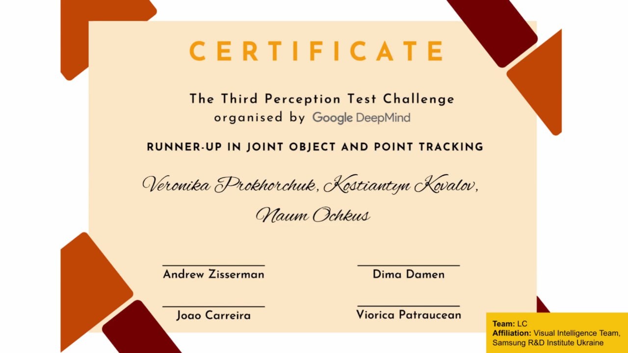 This year, the third Perception Test Challenge received 557 submissions from 81 teams across 5 tracks. Samsung R&D Institute Ukraine has demonstrated top results in Joint Object and Point tracking.