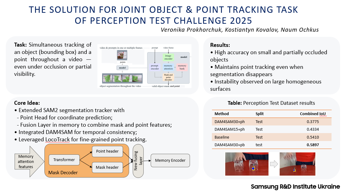 Samsung R&D Institute Ukraine's Visual Intelligence Team's achievement in the Perception Test Challenge at ICCV 2025 highlights our commitment to advancing the state-of-the-art in visual perception. The ability to accurately perform both object and point tracking simultaneously is critical for perception systems in robotics, augmented reality, and embodied AI. Precise point tracking and segmentation can enhance AR/VR experiences by enabling more accurate object interaction and spatial understanding. Our innovative approach and dedication to excellence have positioned us as leaders in the field, driving future innovations in real-world applications.
